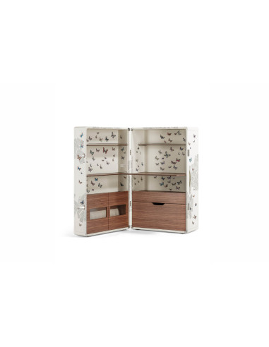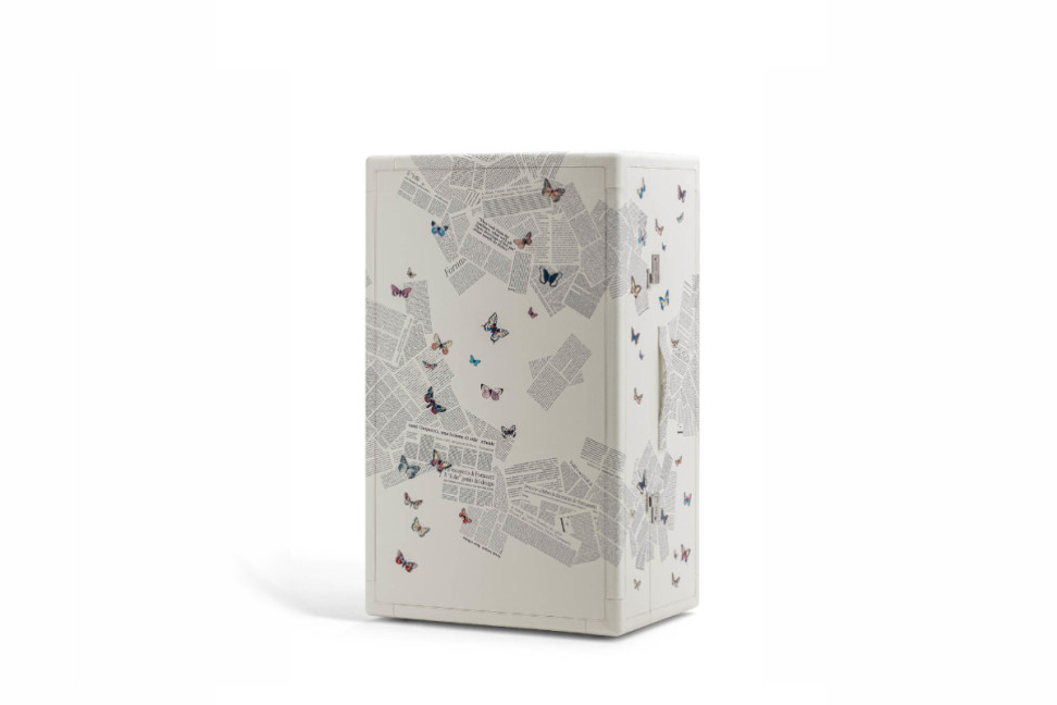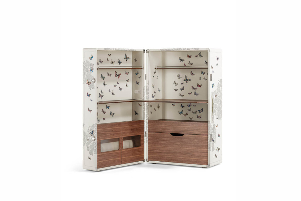 Conçu par Jean-Marie Massaud pour Poltrona Frau et décoré par Fornasetti, le cabinet bar Isidoro Ultime Notizie est une pièce d’auteur habillée de cuir Pelle Frau®, imprimée d’un motif mêlant papillons et coupures de journaux, enrichie de détails en bois précieux.