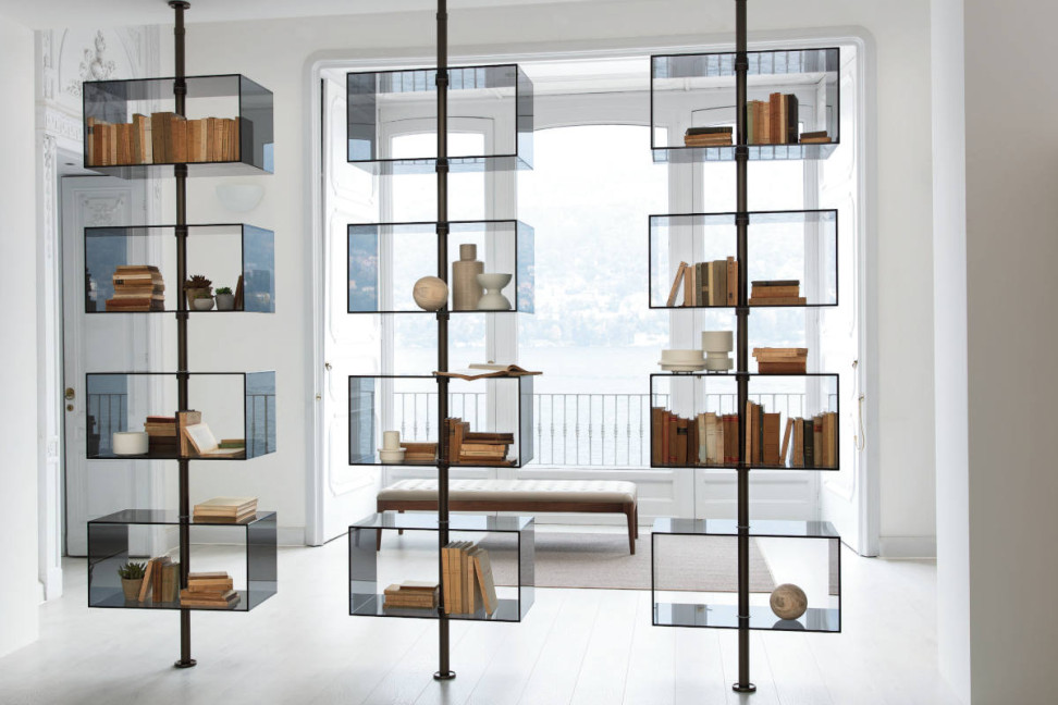 La bibliothèque Domino de Porada est à mi-chemin entre une bibliothèque et un mur équipé : elle est rotative et peut être composée de plusieurs modules.