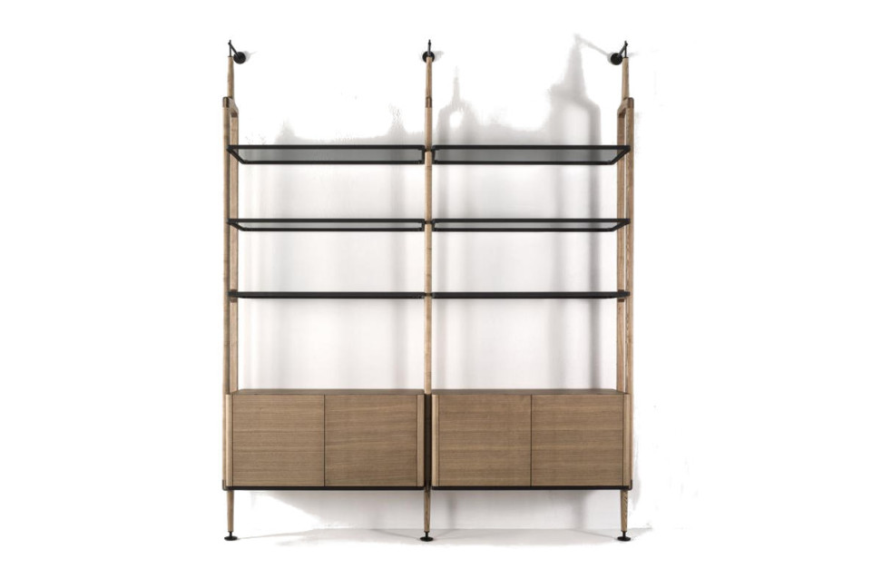 La structure porteuse est en bois de frêne et peut être accrochée au plafond ou au mur. La large gamme d'éléments structurels, tels que des étagères en verre fumé ou en bois de frêne, des conteneurs avec des portes battantes et à rabat ou avec des tiroirs, confère à Aria de Porada une liberté de composition absolue, permettant de créer des solutions qui s'adaptent mieux à ses besoins esthétiques et habitables.