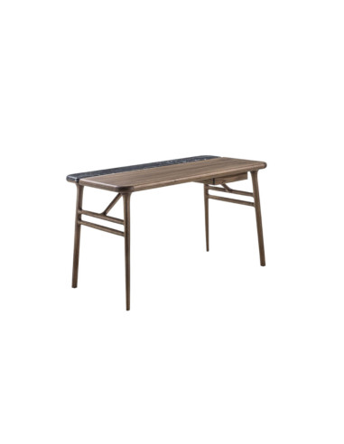 Le design du scrittoio Aksel, de Meneghello Paolelli, est caractérisé par la fusion entre la légèreté et la robustesse du bois massif de noyer canaletta, dont les veines sont mises en valeur par la finition naturelle. Le plan de travail en bois est divisé en deux parties nettement distinctes et séparées par une interstice : le plan de bureau principal en noyer canaletta avec bord massif et la bande arrière en noyer canaletta, en marbre ou recouverte de cuir Plus. Le plan est soutenu par des pieds en noyer canaletta, reliés à mi-hauteur par deux montants, d'où s'étend un autre lien transversal qui fixe la partie centrale du plan. La structure contribue à accentuer la linéarité et la stabilité du design.