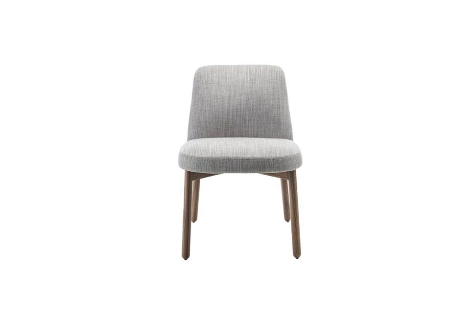 La chaise Abby se présente avec une structure classique en bois massif de frêne ou de noyer canaletta et un revêtement au choix parmi les tissus de la collection Porada.