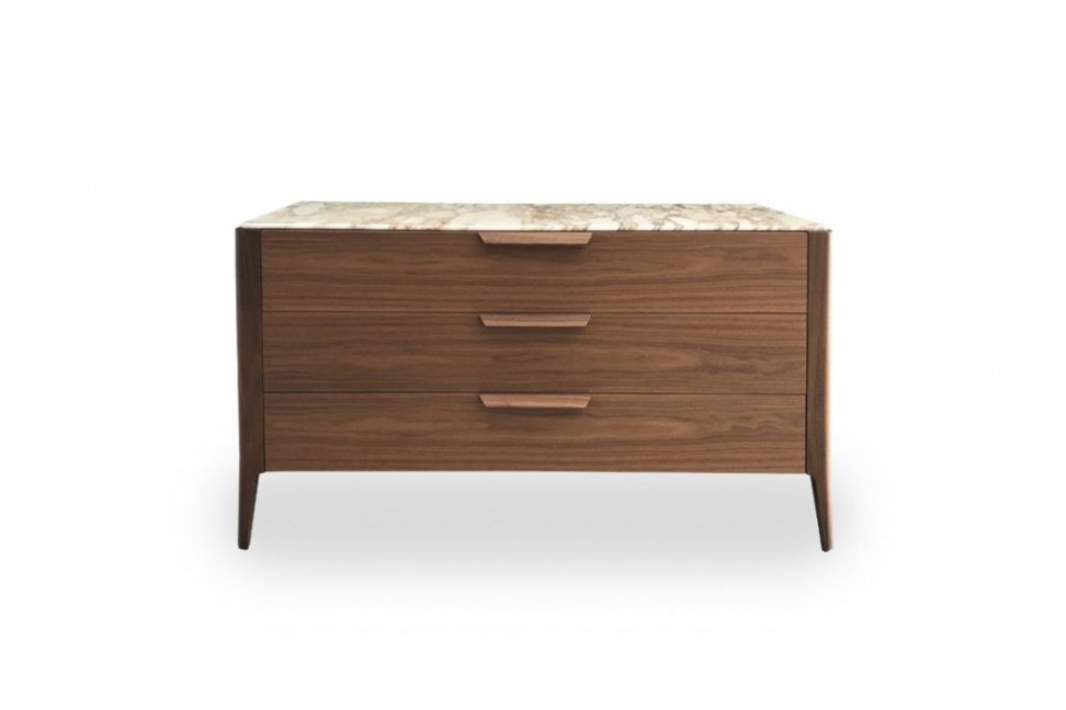 Composée d'une commode et de tables de chevet, cette collection naît d'un projet que le designer italien Carlo Ballabio a réalisé pour la célèbre entreprise leader dans le secteur du mobilier et se caractérise par une structure en bois massif linéaire et essentielle, embellie par un plateau en marbre ou en cristal qui met en valeur ses formes.