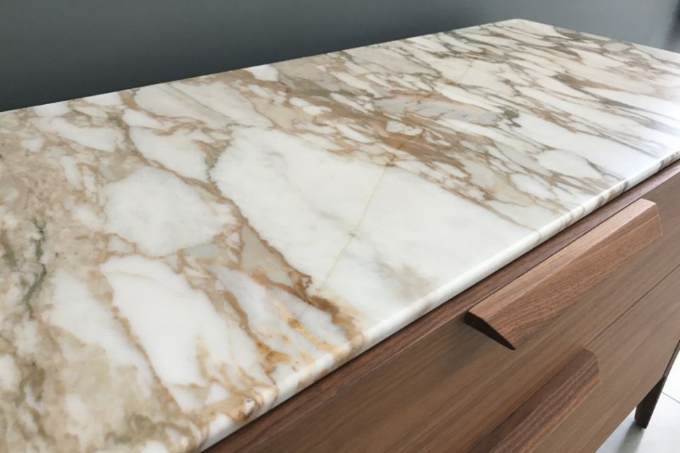 La commode Ziggy Night, en offre expo dans notre showroom, présente une structure en noyer canaletto avec 3 tiroirs et un plateau en marbre blanc Calacatta oro.