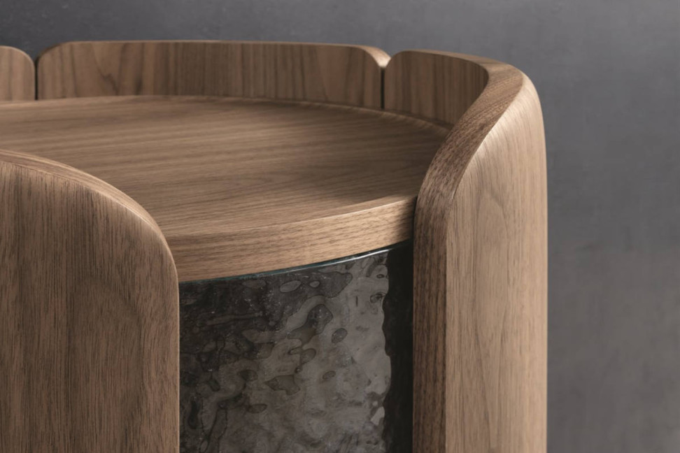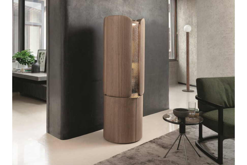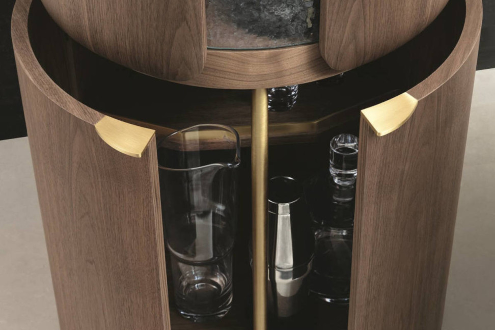 Disponible en différentes finitions, Mary présente une structure avec des portes battantes courbées en noyer canaletta avec des détails en verre Ice. Le compartiment supérieur a le fond en laiton brossé et est équipé d'un système d'éclairage intérieur à LED avec capteur de présence. Le meuble bar est maintenant inclus dans le nouveau catalogue Nineteen, qui rassemble les nouveautés 2019 des collections signées Porada.