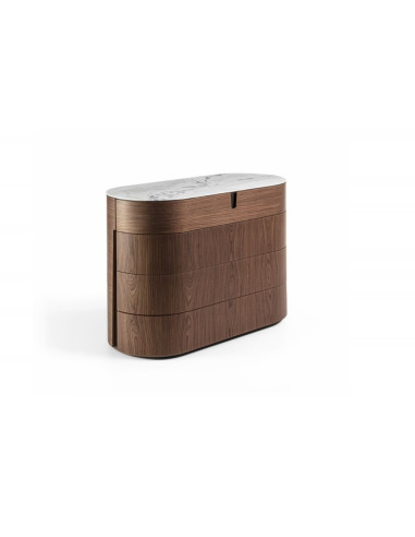 La structure de la commode est réalisée en frêne ou en noyer canaletta. Le plateau peut être réalisé en bois ou en marbre de différentes qualités. Un détail distinctif de la Tylsa Night 4 est la poignée encastrée du tiroir supérieur, qui présente un fond en métal avec une finition Bronzoro, soulignant l'attention aux détails et conférant une touche d'élégance supplémentaire.