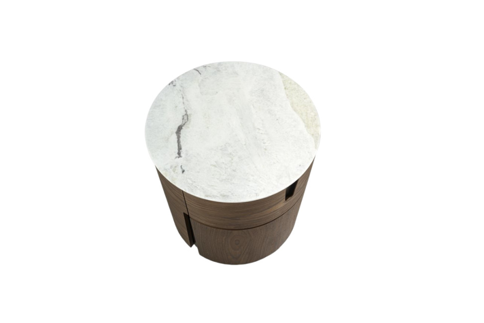 Grâce à son savoir-faire dans la combinaison de matériaux différents, comme le bois et le métal, Danilo Radice confère à ses créations un caractère unique et ajoute la composante en marbre pour le dessus des tables de nuit claires ou foncées en association avec le bois choisi pour la structure. La taille de la table de nuit de forme cylindrique est de cm. ø48x54h.