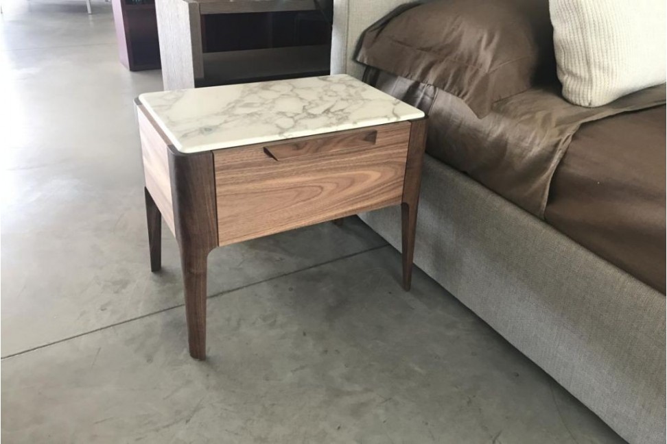 La table de nuit Ziggy Night, en offre expo dans notre showroom, est un complément de mobilier capable d'apporter une atmosphère recherchée à votre chambre, grâce à la combinaison de la structure en noyer canaletto et du plateau en marbre blanc Calacatta or. La table de nuit est également dotée d'un tiroir pratique pour ranger vos objets personnels.