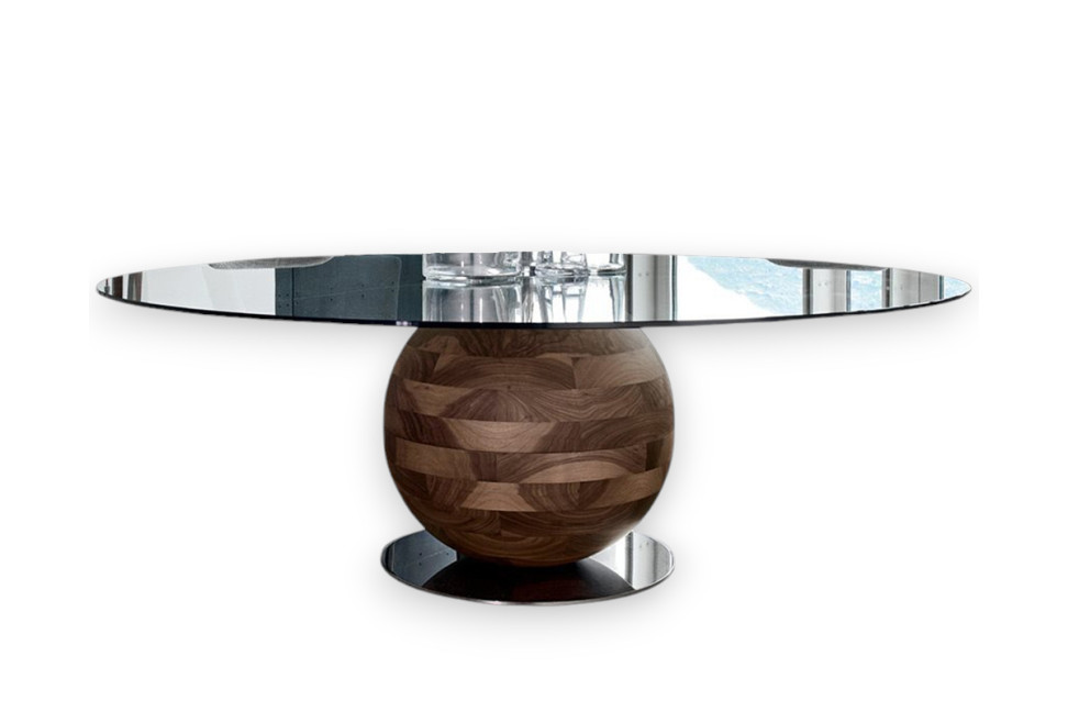 Gheo-k di Porada est une table qui se distingue par sa base arrondie en bois massif et disponible en différentes finitions.