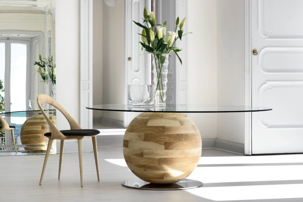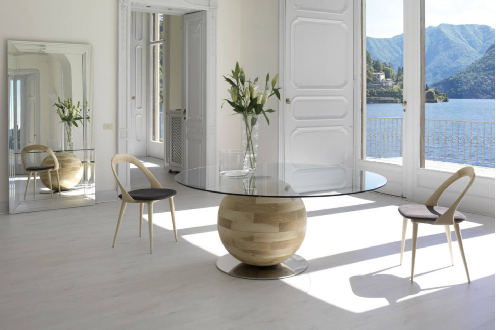 Gheo-off de Porada est une table à manger au design original. Elle se distingue par sa base particulière en forme ronde réalisée en bois massif de noyer Canaletto ou de frêne et montée sur une plaque en métal.