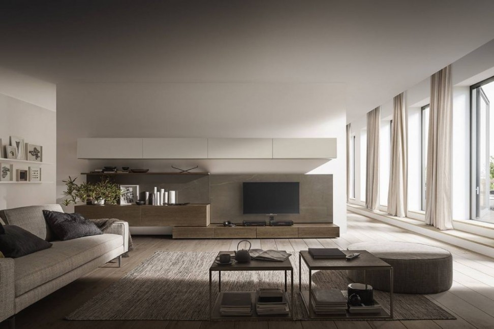 Ce système de jour permet - grâce à ses éléments modulables - de disposer d'un mur équipé avec des étagères, des éléments pour TV, des tablettes, des espaces, des tiroirs, des bases et des plateaux.