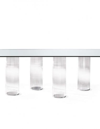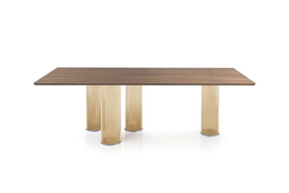 Les designers Reflex Angelo mettent au centre le travail artisanal du verre pour la création de la table Signore degli Anelli. La base est composée de cylindres en verre de Murano et est disponible avec une finition transparente ou dans les couleurs rouge, bleu, aquamarine, ambre, tabac ou améthyste. Le plateau est proposé en verre transparent à fil brillant, en verre Marbre ou en Bevel Wood Noce Canaletto, Chêne Henné, Chêne Miel ou laqué mat dans les couleurs lait, fumée, henné. La table Signore degli Anelli est également disponible dans la version Steel, avec des cylindres en laiton, laiton foncé et titane.Reflex