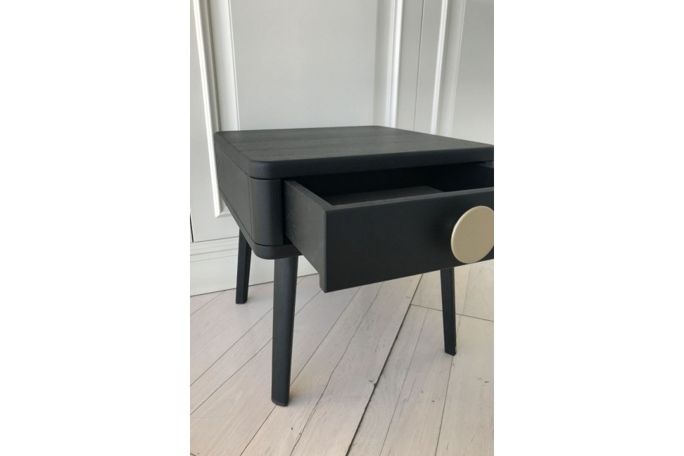 La table de nuit 916 en promotion Expo dans notre showroom présente un corps en chêne noir pigmenté et une poignée en hêtre laqué couleur ocre-beige métallique.