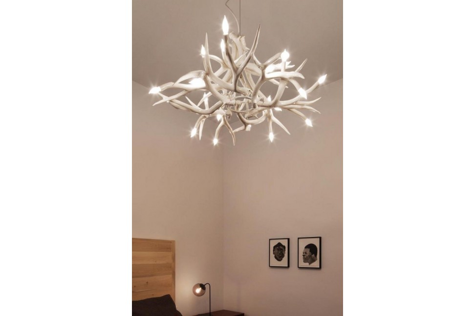 Antler est une lampe au style unique et véritable protagoniste de l'ensemble de l'environnement grâce à son design original, inspiré par la nature et visant à en exalter la beauté et la puissance. Sa structure est en effet constituée d'un entrelacement d'éléments réalisés en céramique, qui rappellent la forme des majestueuses cornes des cerfs. La lampe, réalisée dans les couleurs blanc, or, chromé et noir, est mise en valeur par les petits points lumineux situés aux extrémités, qui, selon le modèle, peuvent prendre différentes configurations et présenter de 4 à 27 LED. La collection Antler inclut également la lampe murale et de table.