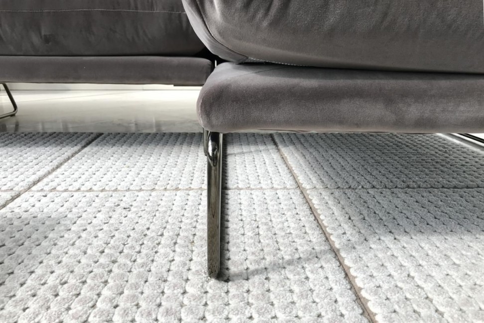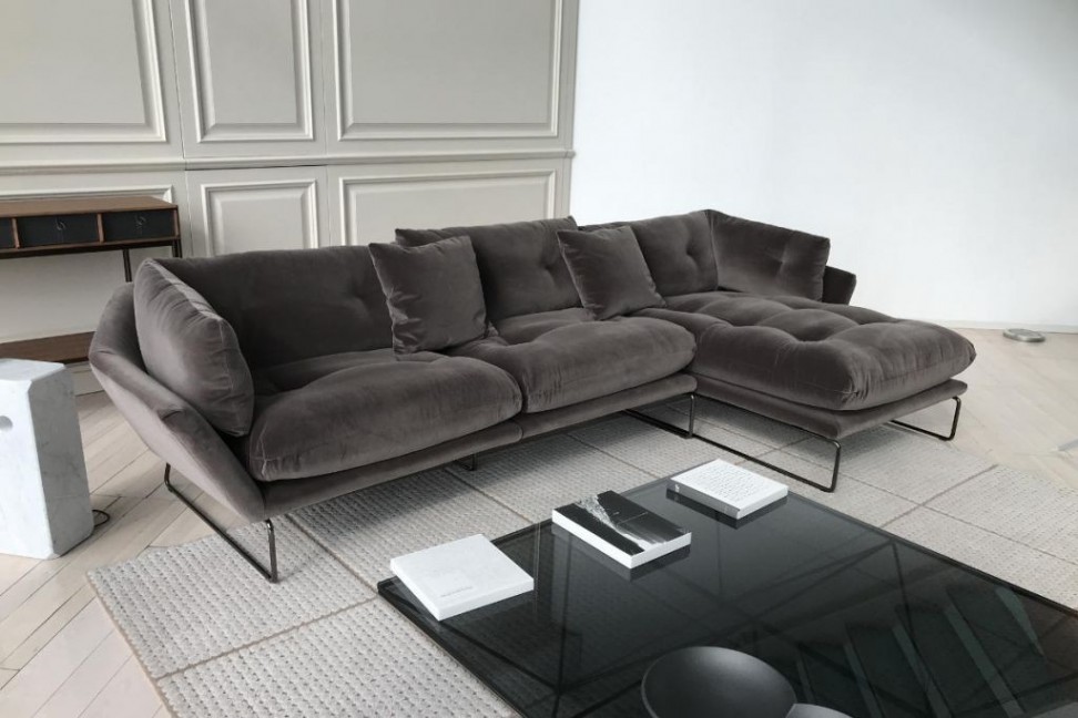 Le canapé New York Suite, en offre expo dans notre showroom, impressionne par son style urbain et accueillant caractérisé par un doux revêtement en velours marron associé à des pieds en noir nickel poli qui apportent luminosité et légèreté au canapé et contribuent à rendre l'environnement moderne et dynamique.
