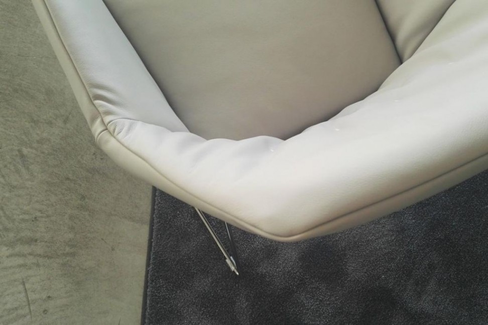 Chaise avec accoudoirs revêtue en cuir de couleur gris clair et base en métal chromé brillant.