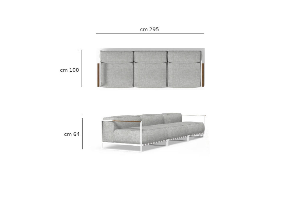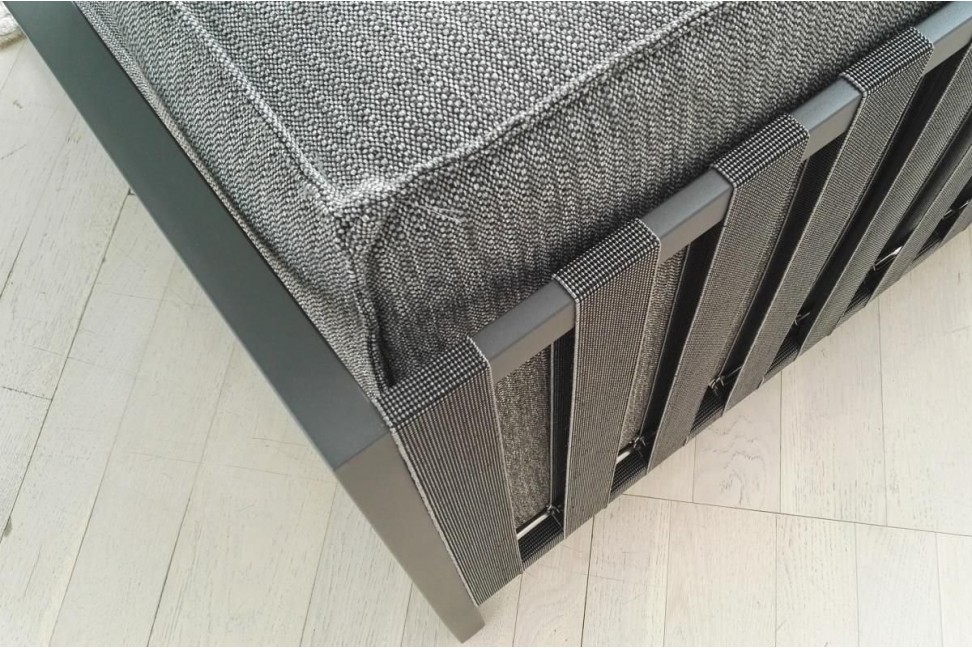 Constitué d'une structure en métal peint en poudre, Casilda trouve ses signes distinctifs dans les sangles en polyester qui s'alternent le long de la structure et dans les larges coussins recouverts de tissu.