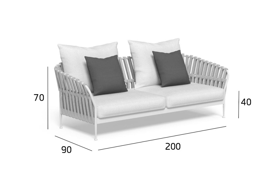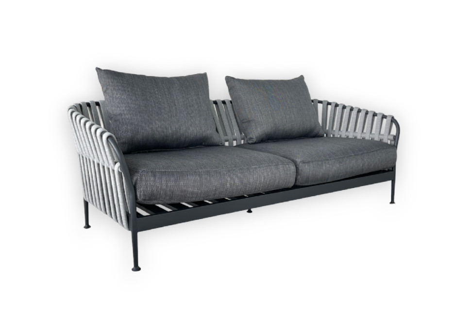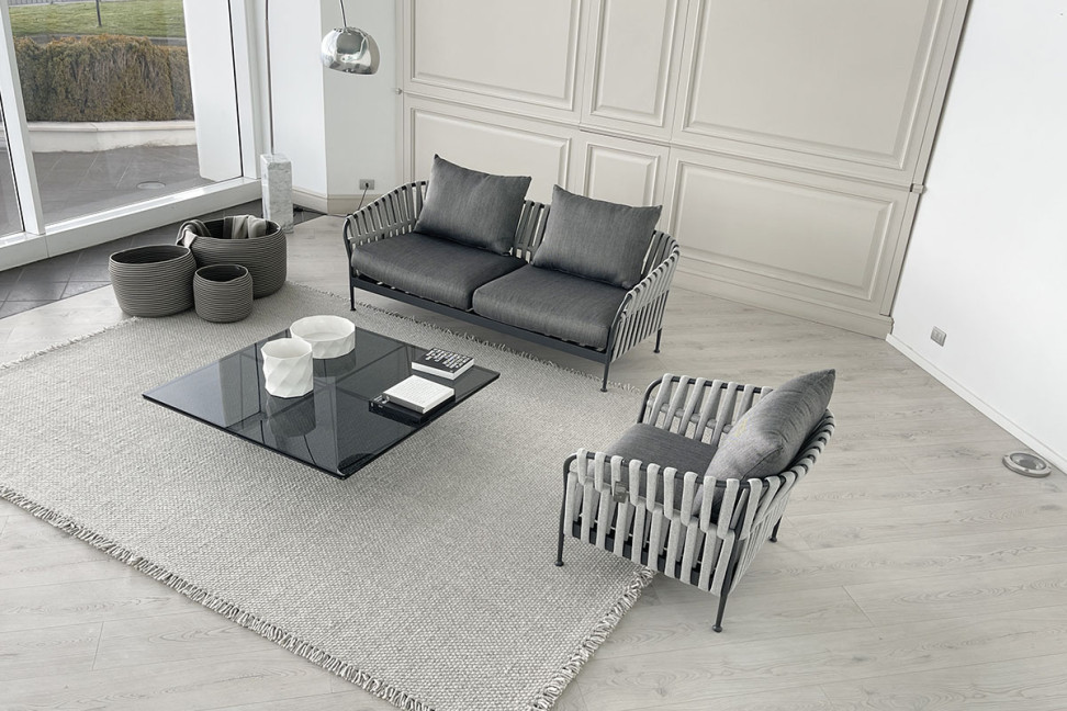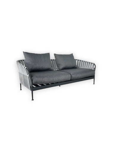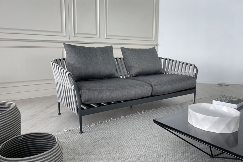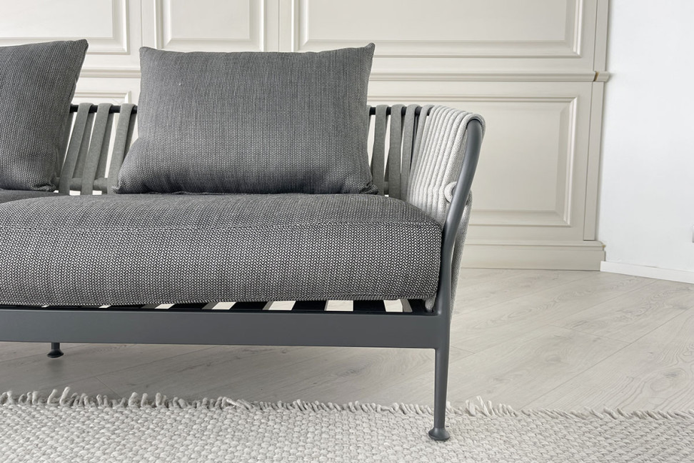 Le canapé d'extérieur Frame en Offre Expo dans notre showroom est caractérisé par une structure en aluminium et un dossier en cordes tressées. Les coussins d'assise et de dossier sont recouverts de tissu.