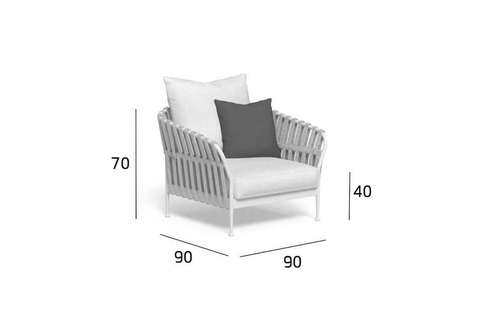 Le fauteuil d'extérieur Frame en Offre Expo dans notre showroom présente une structure en aluminium et un dossier en cordes tressées. Les coussins d'assise et de dossier sont recouverts de tissu.
