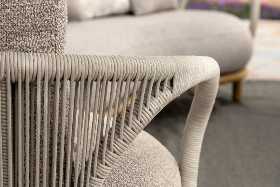 Riche en suggestions tribales, le fauteuil Living outdoor Karen de Ludovica Serafini et Roberto Palomba pour Talenti libère la beauté des terres africaines. Ce siège design s'inscrit dans la collection homonyme qui rend hommage à Karen Blixen, auteure de La ma Afrique. Les lignes sinueuses du dossier et les accoudoirs en anneau confèrent au fauteuil la royauté d'un trône et en même temps transmettent sécurité et protection. Le travail artisanal du dossier, enveloppé de innombrables fils qui s'entrelacent avec les accoudoirs, rappelle en effet le design d'un cocon rassurant qui crée une atmosphère intime et sereine dans l'environnement extérieur où il se trouve. Le revêtement est déhoussable et disponible en tissus conçus pour résister aux intempéries.