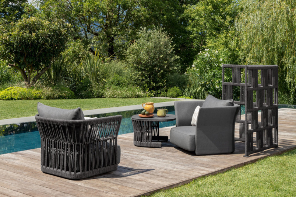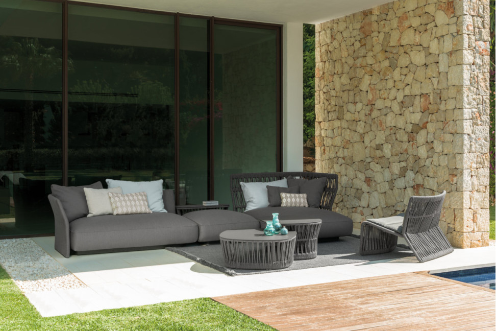 aux formes simples et géométriques. On retrouve également dans cette table basse design le trait distinctif de la collection : le tissage des cordages nautique qui recouvrent la base en métal. La table basse d'extérieur Cliff Dèco est disponible en trois tailles différentes, dans les versions beige et graphite : cm.85x35x45h, cm.75x75x45h et cm.90x90x35h. De dimensions différentes, les petites tables de la collection Cliff peuvent s'assembler pour créer un ensemble unique, moderne et raffiné.