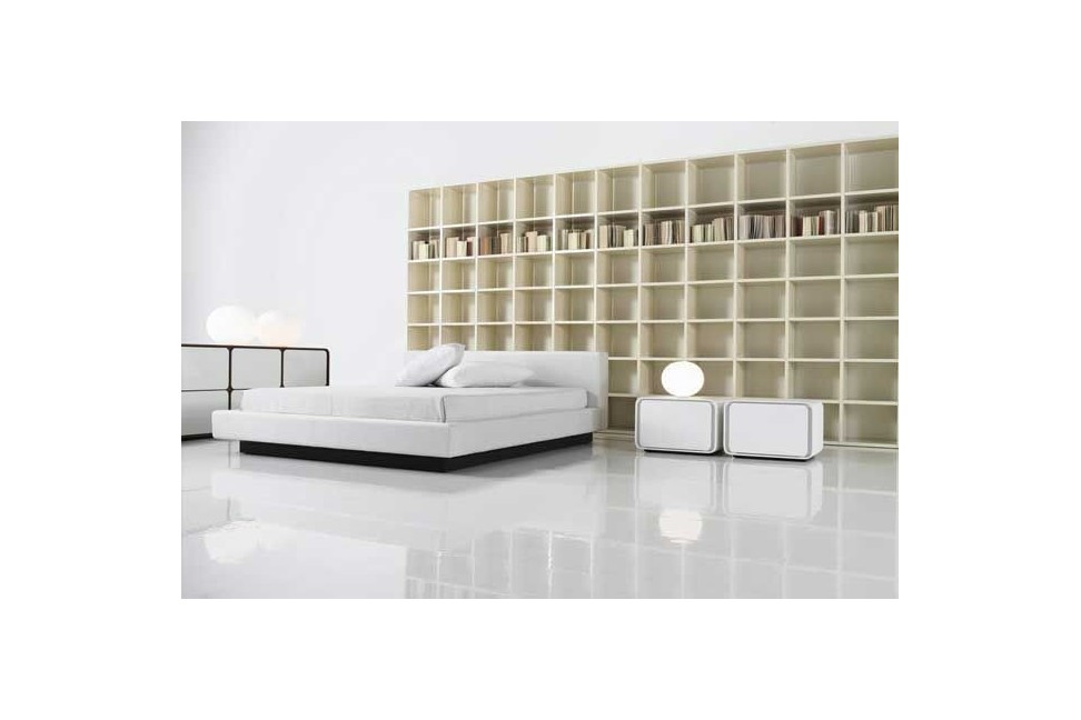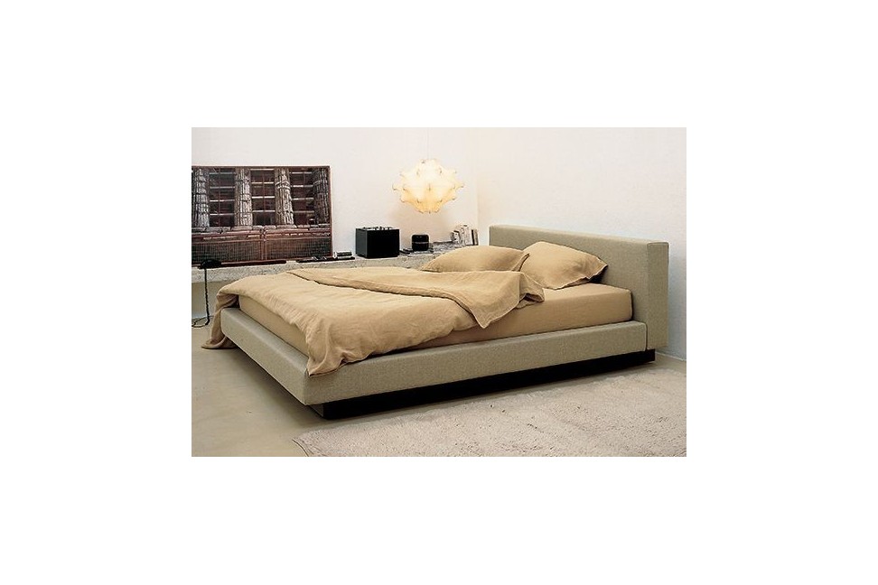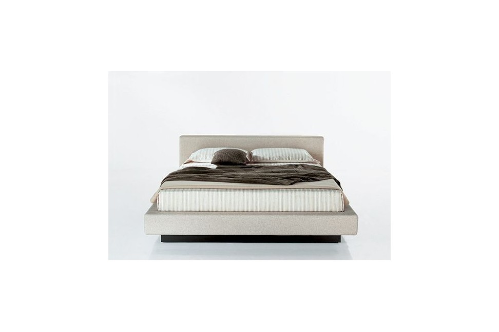 Le lit Japo est composé d'une base et d'une tête de lit rembourrées et recouvertes de tissu déhoussable ou de cuir, et d'un socle laqué couleur anthracite. Sur demande, il est disponible dans la version avec un espace de rangement sous le matelas.