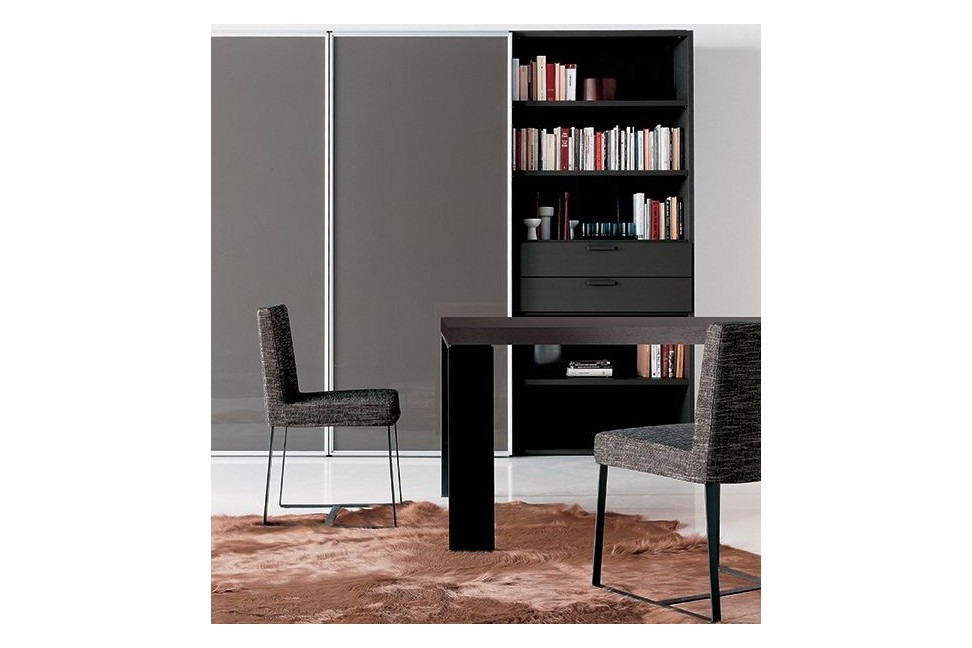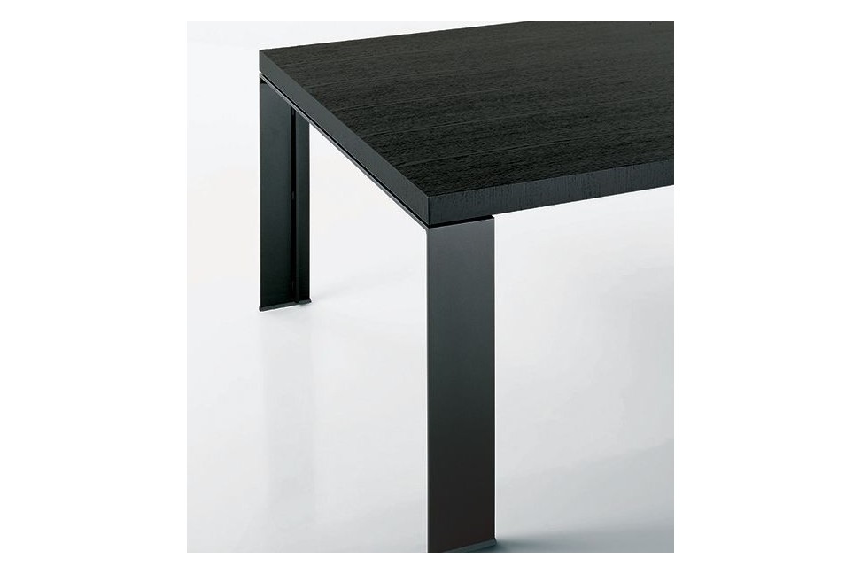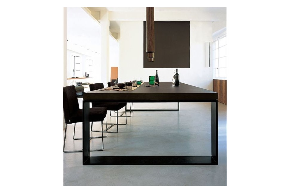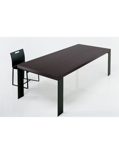 La table Vittorio de Tisettanta se caractérise par une forme rectangulaire (version fixe) avec un plateau en bois et des pieds en métal brunis.Plusieurs versions sont disponibles :