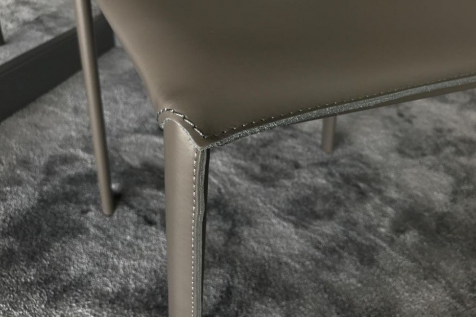 La chaise Corium, en offre expo dans notre showroom, présente un revêtement en cuir de couleur marron foncé caractérisé par des coutures apparentes de couleur plus claire qui courent le long de tout le périmètre de la structure.