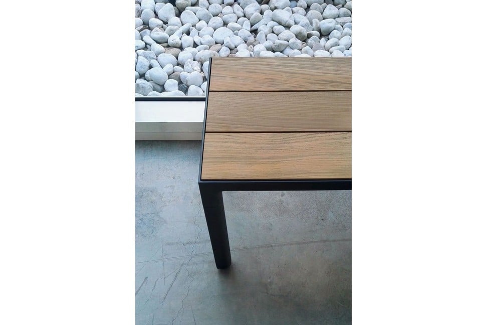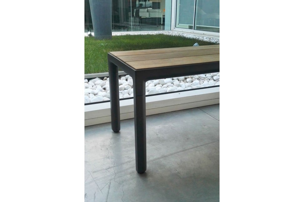 Banc avec structure en aluminium teinté wengé (couleur marron foncé) et assise en teck.