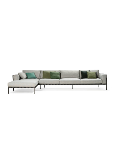Le design du canapé Natal Alu, conçu par le Studio Segers, est un dessin typique Tribù : un cadre très fin avec des accoudoirs courbés qui contraste avec le volume des coussins.