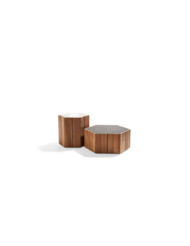 Dans la réalisation de la table Hexagon de Tribù, Merckx s'est inspiré de la Chaussée des Géants, un affleurement rocheux naturel situé sur la côte nord-est de l'Irlande. La structure du table basse Hexagon en teck, de forme hexagonale comme le nom l'indique, rappelle la configuration saisissante des roches. Disponible en deux tailles, elle présente un plateau en pierre volcanique émaillée, dans les couleurs lin ou océan. Tribù en collaboration avec le designer belge a utilisé pour ce mobilier d'extérieur des matériaux résistants aux intempéries.