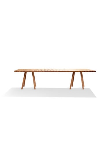 La table d'extérieur Vis à Vis de Tribù est réalisée en teck, matériau préféré du designer Piergiorgio Cazzaniga car il se distingue par sa ligne essentielle et épurée qui confère à chaque élément de mobilier.