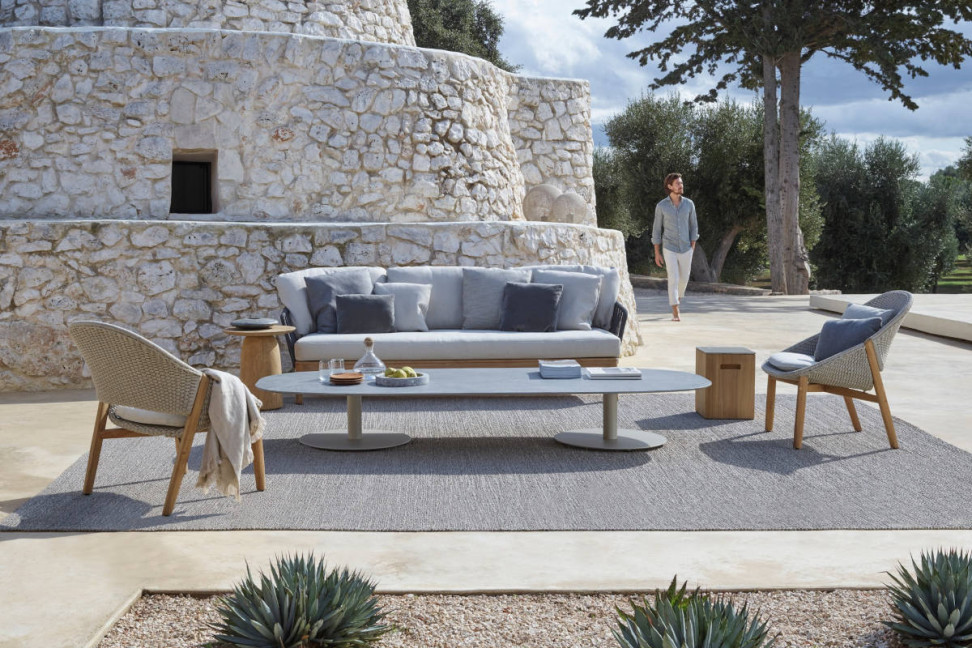 Le tapis Loft de Tribù Studio produit par la même entreprise belge de mobilier d'extérieur Tribù, est fait en polyester enduit de PVC, résistant au soleil et à la pluie et extrêmement durable, sans négliger cependant la douceur et l'aspect naturel. Ce tapis est disponible en White, Wengè et Linen et est parfait pour donner continuité aux différents compléments de design de la zone de vie en plein air.