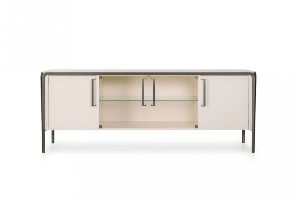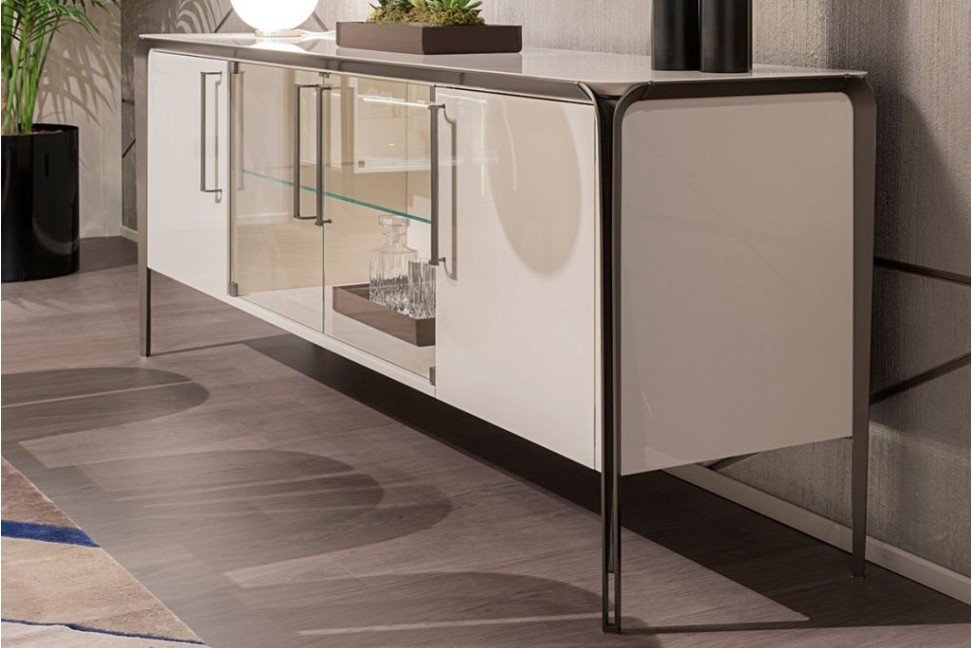 La collection Milano a été conçue par le studio SBGA | Blengini Ghirardelli pour Turri. Le buffet Milano est un produit élégant et sophistiqué avec une structure en bois laqué et de fines jambes en métal avec des inserts en cuir. La partie frontale du buffet présente quatre portes avec des poignées en métal courbé : deux en bois sur les côtés et deux en verre au centre. Le buffet Milano est disponible dans les finitions de l'échantillon Turri.