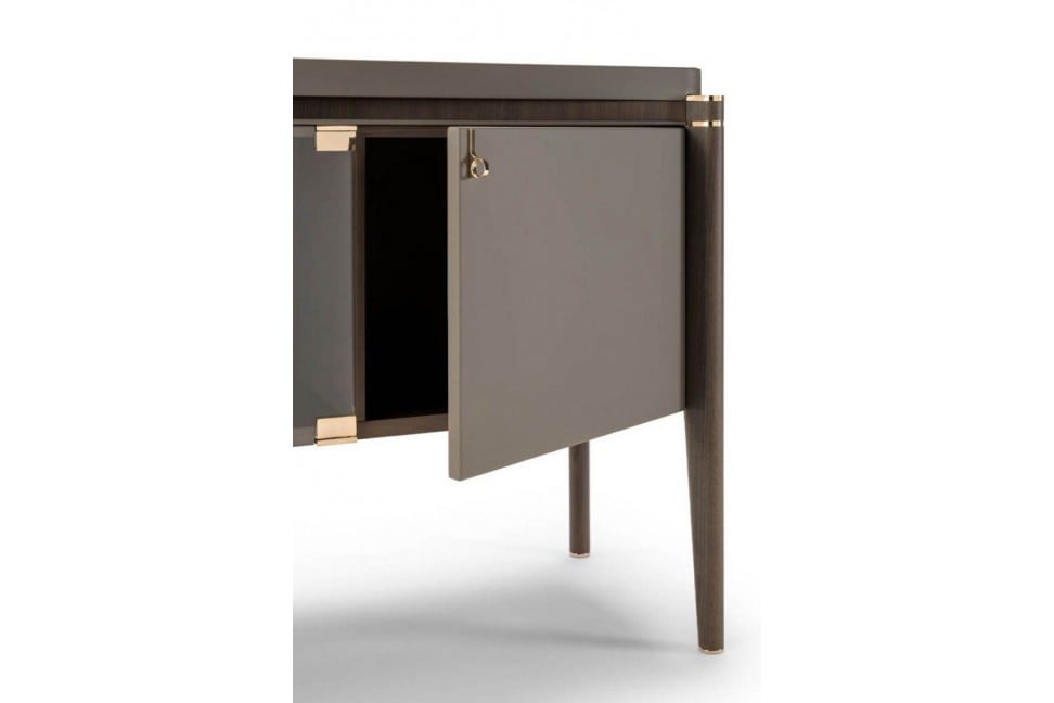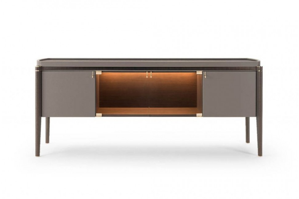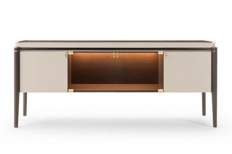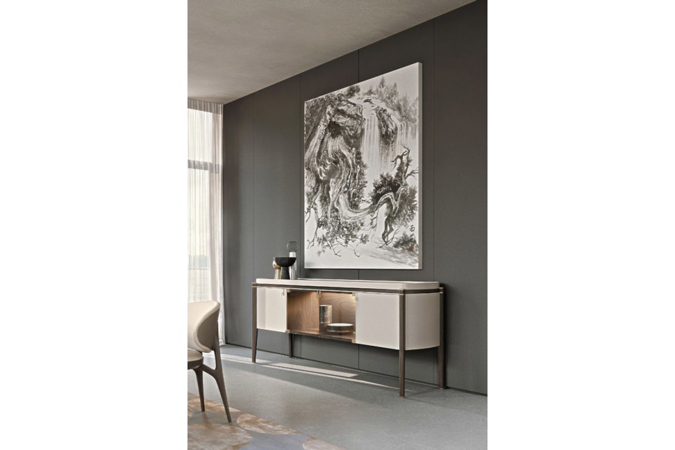 La collection Pinnacle, nouveauté 2021 de Turri, s'enrichit avec le buffet qui propose une combinaison déjà connue pour la marque, à savoir l'association du cuir et du bois dans la structure. L'élégance du buffet Pinnacle est donnée par les éléments courbes de la structure qui s'opposent aux pieds plus linéaires. Le plateau, élément optionnel, peut être en marbre ou en bois et le meuble est équipé d'un système d'éclairage interne à Led, en plus d'être rehaussé de détails en or.Turri