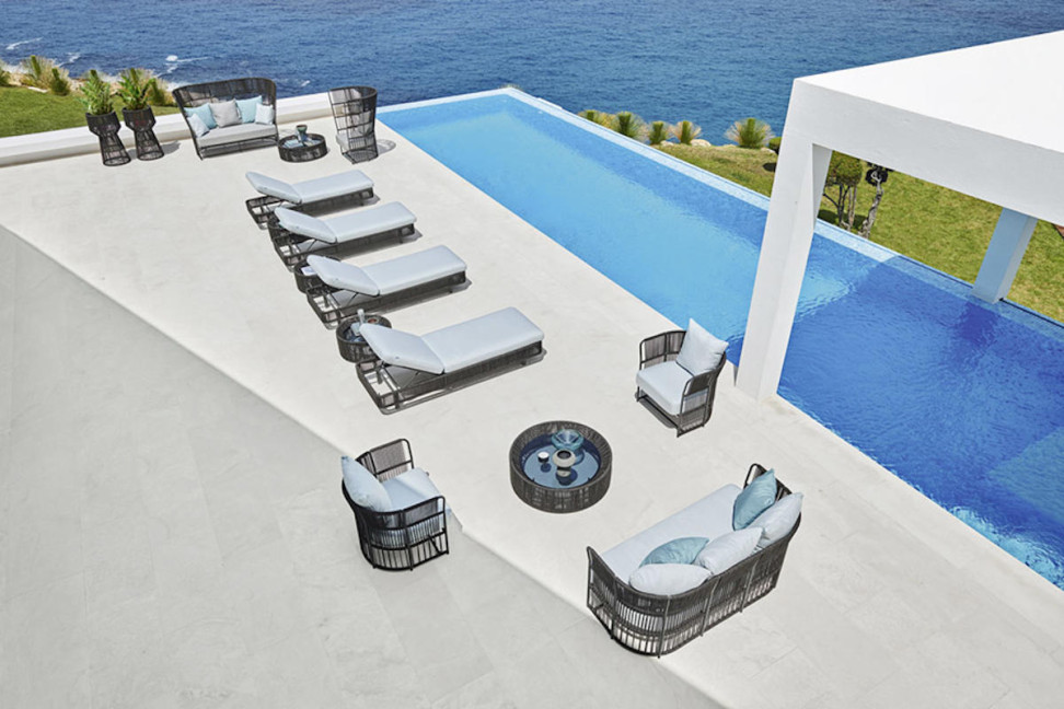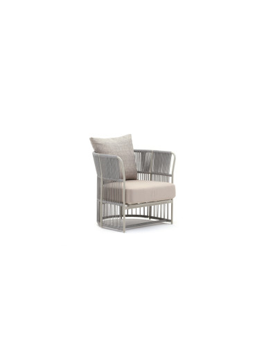 La structure en aluminium ainsi que l'entrelacement à la main en fibre peuvent être personnalisés en choisissant parmi les différentes couleurs et finitions disponibles dans le catalogue. Le revêtement des coussins est également disponible en plusieurs teintes.