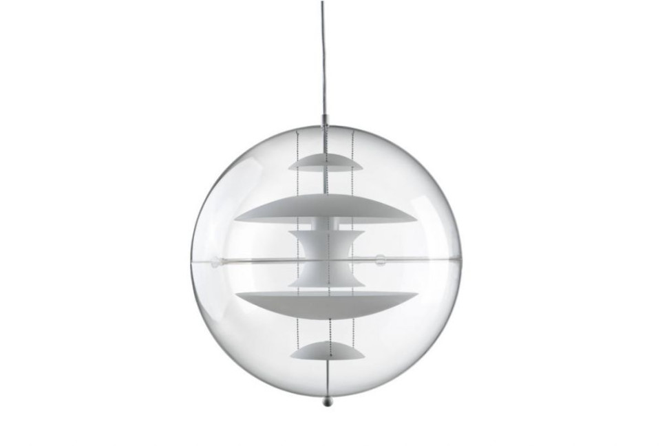 Cette collection de lampes a été dessinée en 1969 par le célèbre Verner Panton, designer visionnaire et génial qui a su créer des éléments de mobilier devenus le symbole d'une époque. La lampe VP Globe, produite par l'entreprise Verpan, est un objet de design unique qui cache une composition architecturale complexe : elle est en effet formée d'une sphère transparente contenant 4 dômes en aluminium suspendus par des chaînes en acier. Cette lampe joue avec les reflets sur les différents dômes, réussissant à créer un effet de lumières extrêmement fascinant, de plus, même éteinte, elle conserve un charme qui ne passe certainement pas inaperçu.