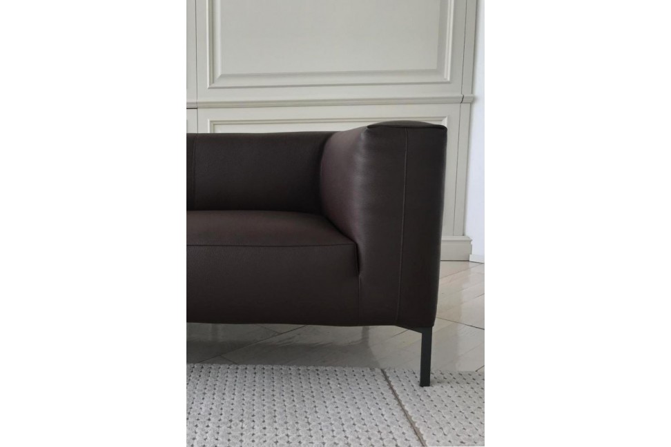 Canapé avec revêtement en cuir de couleur marron foncé et pieds en métal gris mat.