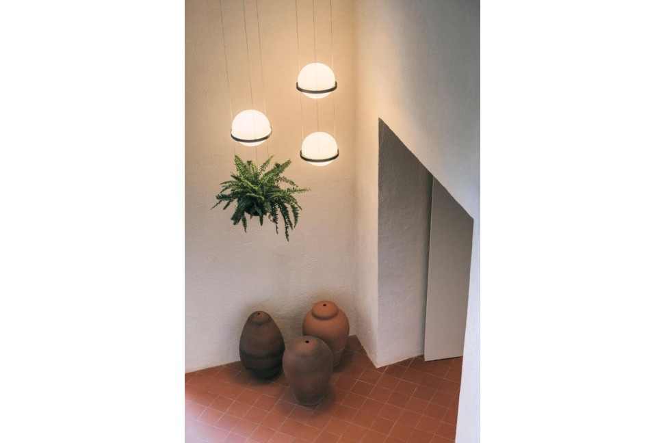 L'expérimentation artistique du designer Antoni Arola sur les matériaux et les nouvelles technologies se reflète dans la création de la collection Palma, réalisée pour la prestigieuse marque d'éclairage Vibia.La particularité des lampes qui composent cette ligne est la possibilité d'intégrer dans la structure des décorations florales ou des plantes, qui atténuent la rigidité du métal en descendant délicatement sur les sphères lumineuses en verre soufflé, créant une atmosphère chaude et exotique. La structure en aluminium est disponible en noir ou blanc et embrasse les sphères centralement, les divisant en deux hémisphères lumineux et les maintenant suspendues dans l'air. La lampe à suspension Palma se décline en plusieurs configurations, avec un ou plusieurs diffuseurs, et est également réalisée dans la version murale et de table.