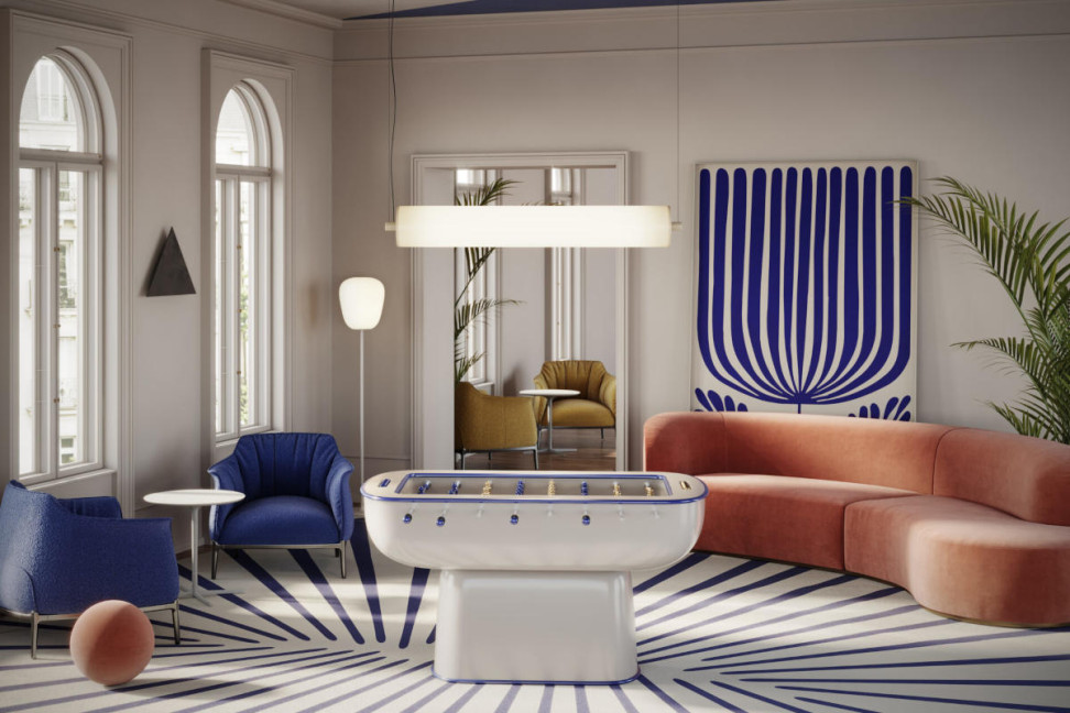 La sinuosité est accentuée par une finition extra brillante. La table de baby-foot Oskar s'exprime au mieux avec une palette pastel, composée de teintes douces et désaturées de vert, bleu, jaune et rose, conférant à la pièce un aspect frais et contemporain, capable de la distinguer des autres tables de jeu.