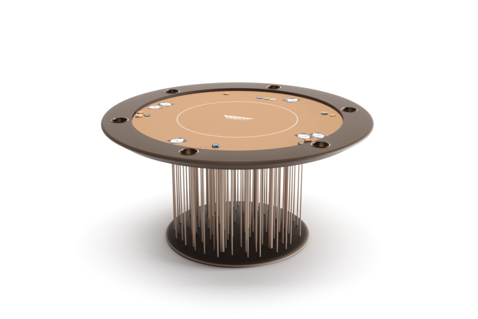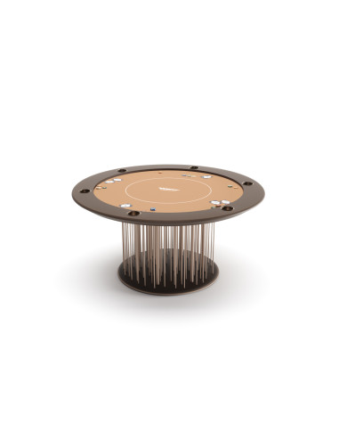La table de Poker Shanghai de Vismara Design réalisée par Pino Vismara se caractérise par une base légère composée de fins bâtonnets laqués. Elle est disponible en versions ronde ou ovale, pouvant accueillir respectivement 6 et 8 joueurs.