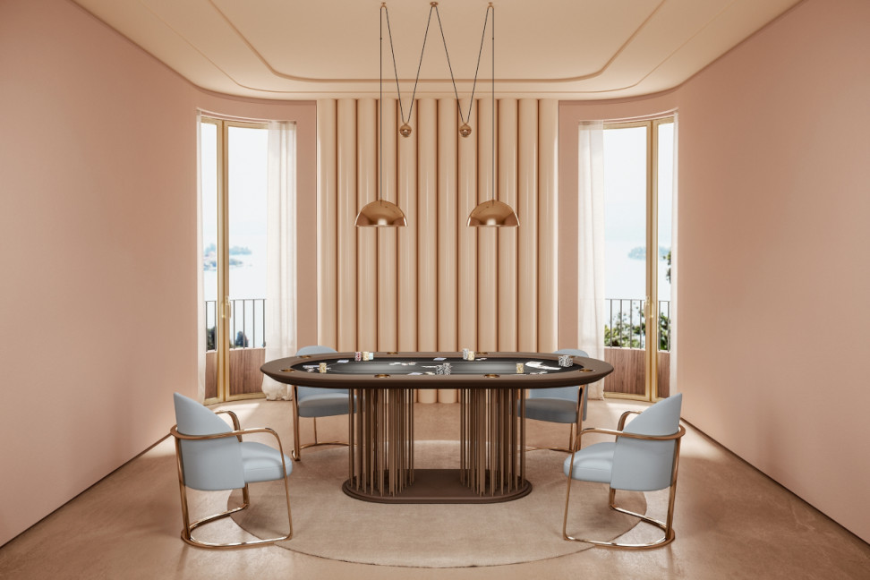 La table de poker Shanghai de Vismara Design, conçue par Pino Vismara, séduit par ses lignes sinueuses et la savante combinaison de matériaux sélectionnés.