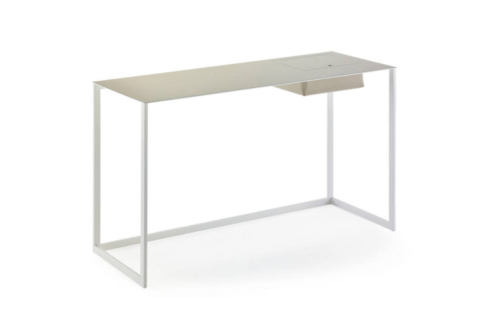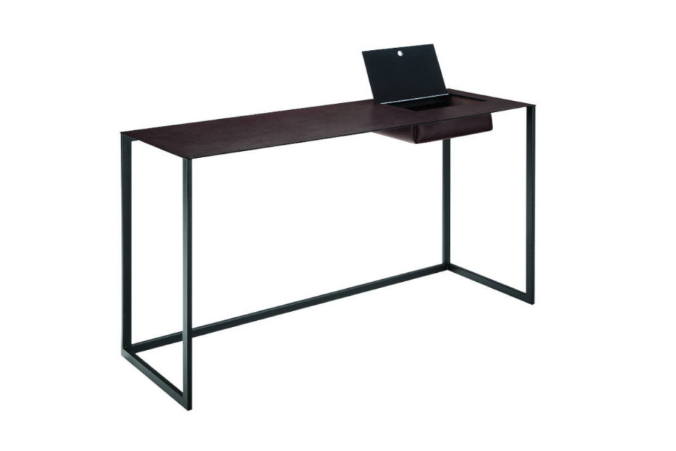 Conçu par le designer Gabriele Rosa, le bureau Calamo est produit par Zanotta, entreprise leader dans le mobilier de design made in Italy. Le bureau Calamo est réalisé avec une structure et un plateau en acier peint dans les couleurs chrome, noir ou graphite. Zanotta enrichit ce modèle avec un plateau comprenant un compartiment de rangement en cuir pigmenté 90. Le compartiment est accessible par une ouverture à rabat.