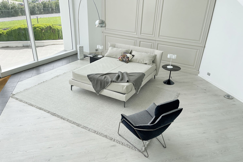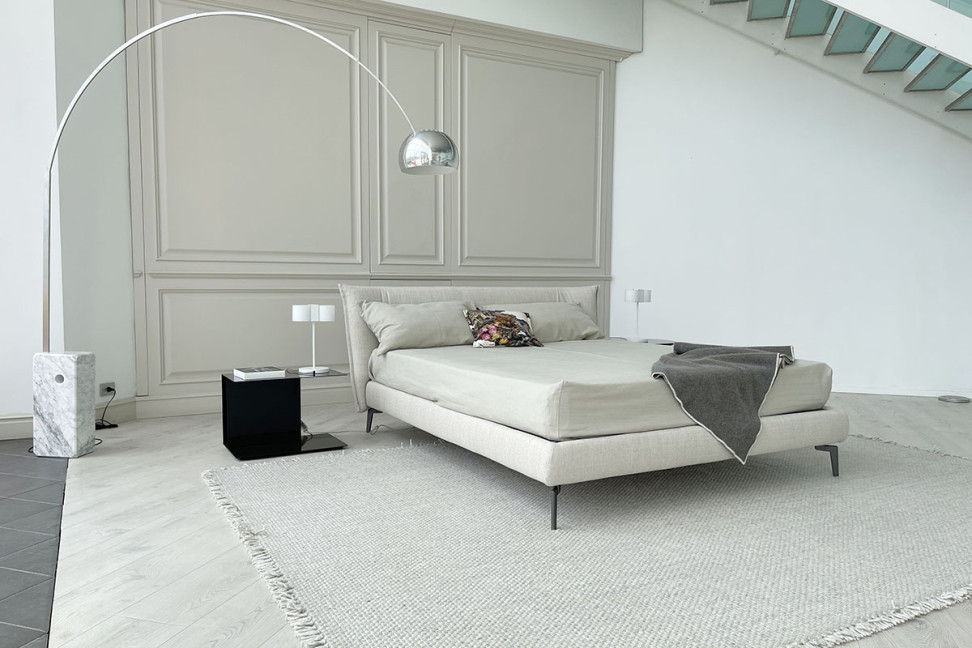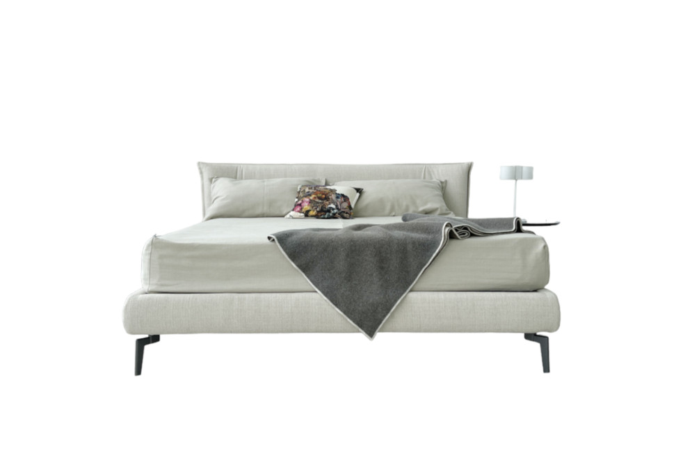 Il letto Morrison, progettato da Enrico Cesana per Alf DaFrè, è un'opera di design imbottita che cattura l'attenzione con le sue sezioni laterali leggermente inclinate.