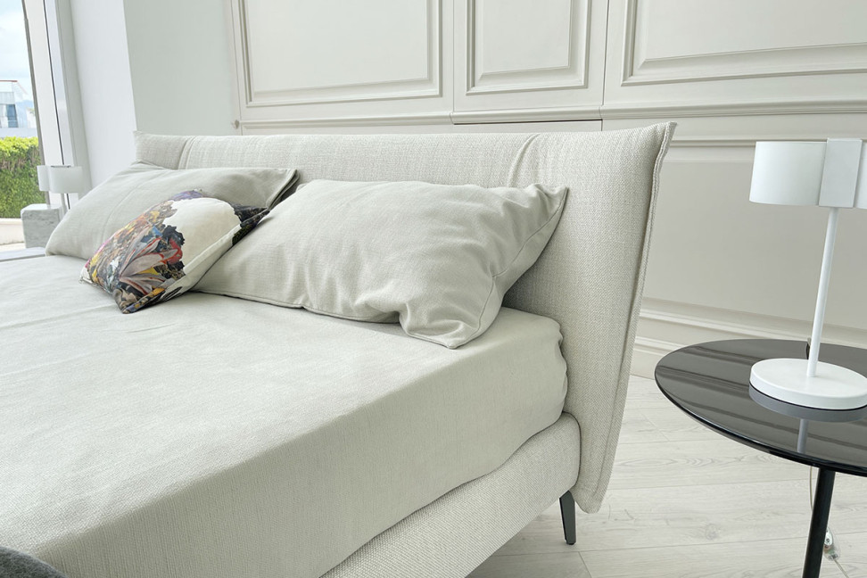 Il letto Morrison in offerta expo presso il nostro showroom presenta piedi in metallo, testiera e giroletto rivestiti in tessuto color tortora chiaro.