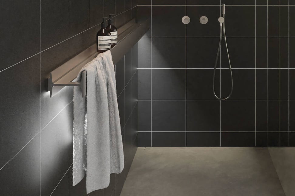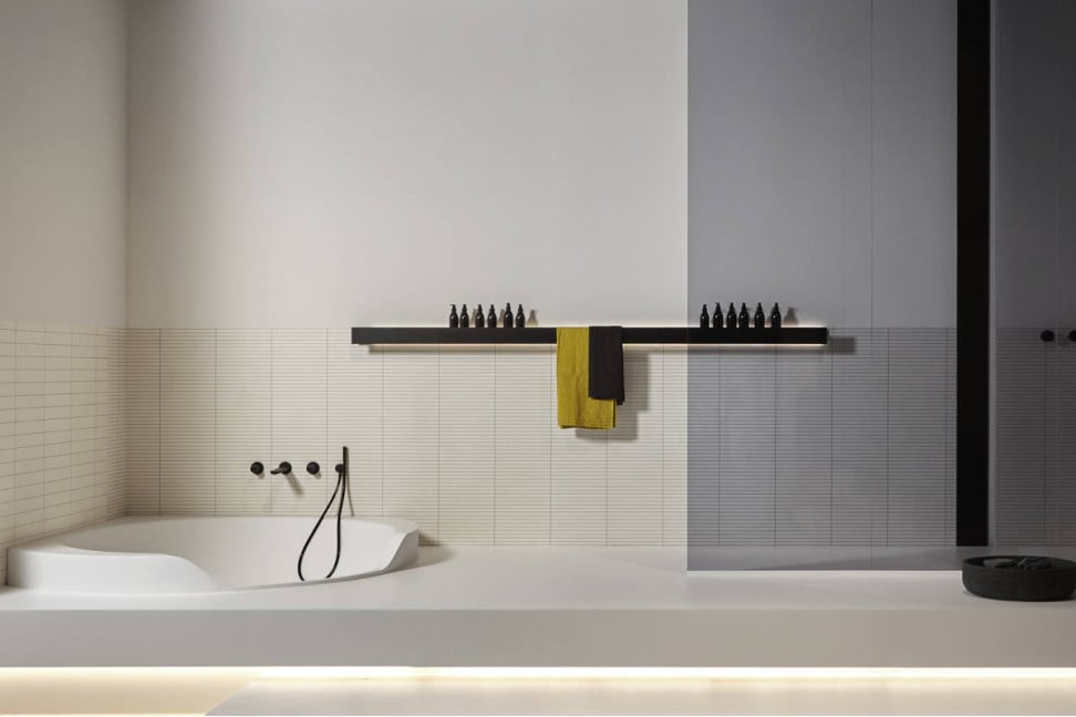 La mensola Letteramuta è di serie in colore Bianco Opaco, ma è possibile selezionare tutti i colori della vasta gamma di Antoniolupi per meglio adattarsi alle nuance del progetto. Nel contesto del bagno, svolge in modo eccellente la sua funzione di supporto accanto alla vasca, consentendo di posizionare tutti i prodotti per la cura del viso o del corpo e, se necessario, di includere un pratico portasalviette. Se utilizzata nella zona doccia, la mensola presenta una fessura centrale per consentire un adeguato drenaggio dell'acqua. Indipendentemente dall'ambiente in cui è installata, la mensola può essere dotata di un sistema di illuminazione a LED incorporato, che può essere posizionato sia nella parte inferiore per illuminare direttamente le superfici sottostanti, sia nella parte superiore per una diffusione più uniforme della luce verso l'alto.