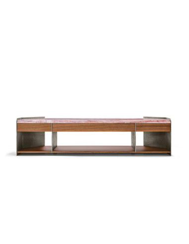 Realizzata con legni raffinati come il zebrano o l'eucalipto, la consolle Truman incarna l'audacia in ogni dettaglio. Il piano in marmo, disponibile in diverse tipologie come Flamingo quartz, Slate grey, Arabesque grey, Niveo white, Tangerine onyx e Moon grey, presenta finiture irregolari che catturano l'attenzione sin dal primo sguardo. Il suo design unico sembra sfidare lo status quo, offrendo un'esperienza visiva straordinaria.
