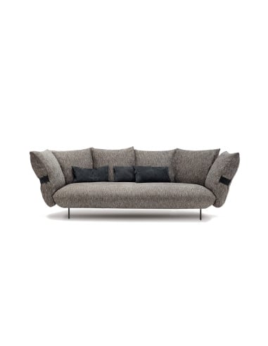 Il divano è disponibile con rivestimento in tessuto o in pelle e presenta delle peculiari fasce sui lati dei cuscini schienale. La base invece è realizzata in metallo ed è possibile scegliere tra varie finiture: black nickel, titanio, marrone micaceo, o oxy grey.