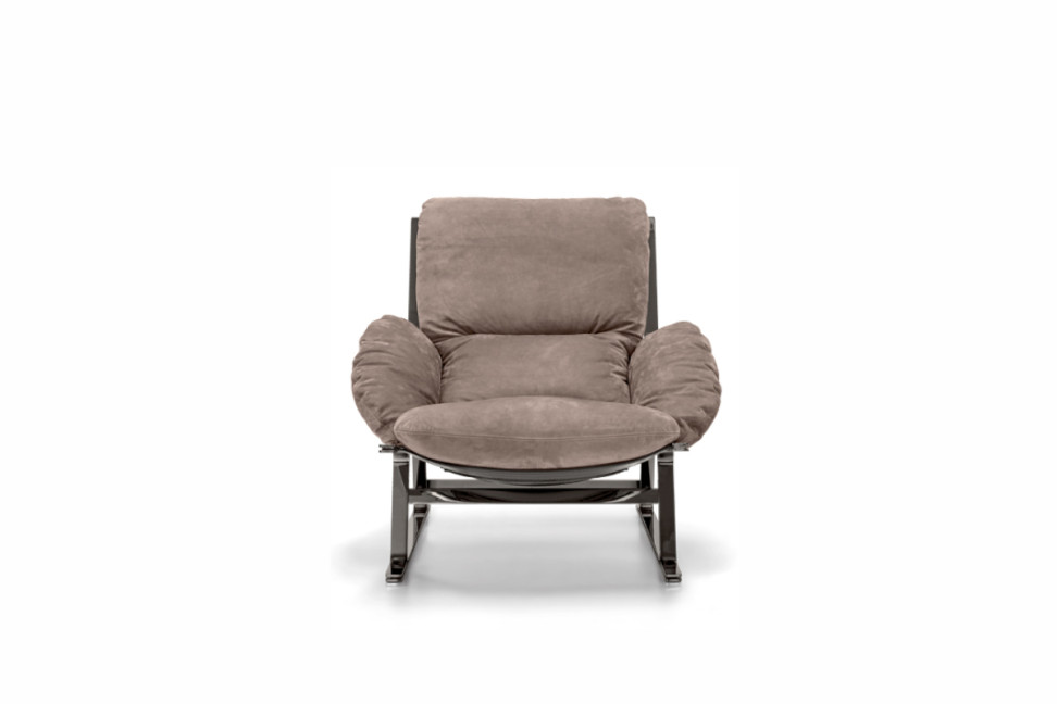 Disponibile sia nella versione in pelle che in tessuto, Belair presenta una base in metallo nelle finiture titanio o black nickel, o verniciato nei colori marrone micaceo o oxy grey, mentre le cinghie possono essere realizzate in pelle o in cuoio. Della linea fa parte anche un comodo pouf, che può essere inserito a completare ed arricchire la poltrona.