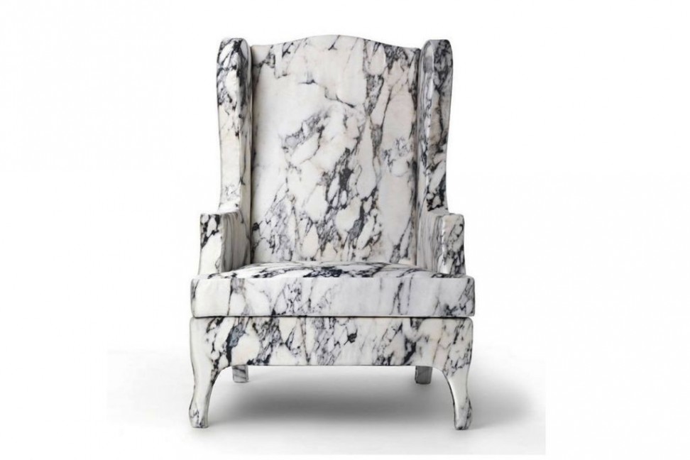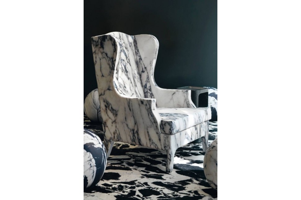 Questa poltrona ha una struttura interna in legno, imbottitura in poliuretano e rivestimento esterno in seta con stampa fotografica del famoso marmo di Carrara, disponibile anche nella versione divano.