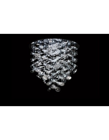 La lampada a soffitto Exagon è costituita da foglie di loto in cristallo collegate da sottili cavi in numero e lunghezza variabile a seconda del modello scelto. Le foglie, disponibili in cristallo trasparente e nei colori bluastro, cedro liquido,e e trasparente con schegge d'oro, costituiscono l'essenza di Exagon, una materia leggera sospesa in aria e illuminata da luci LED, capace di creare un'atmosfera magica e dare leggerezza e fascino all'ambiente. A seconda del modello, nella piastra cromata lucida è possibile inserire da uno a sedici faretti alogeni, che amplificano la luminosità creata dagli elementi in vetro.